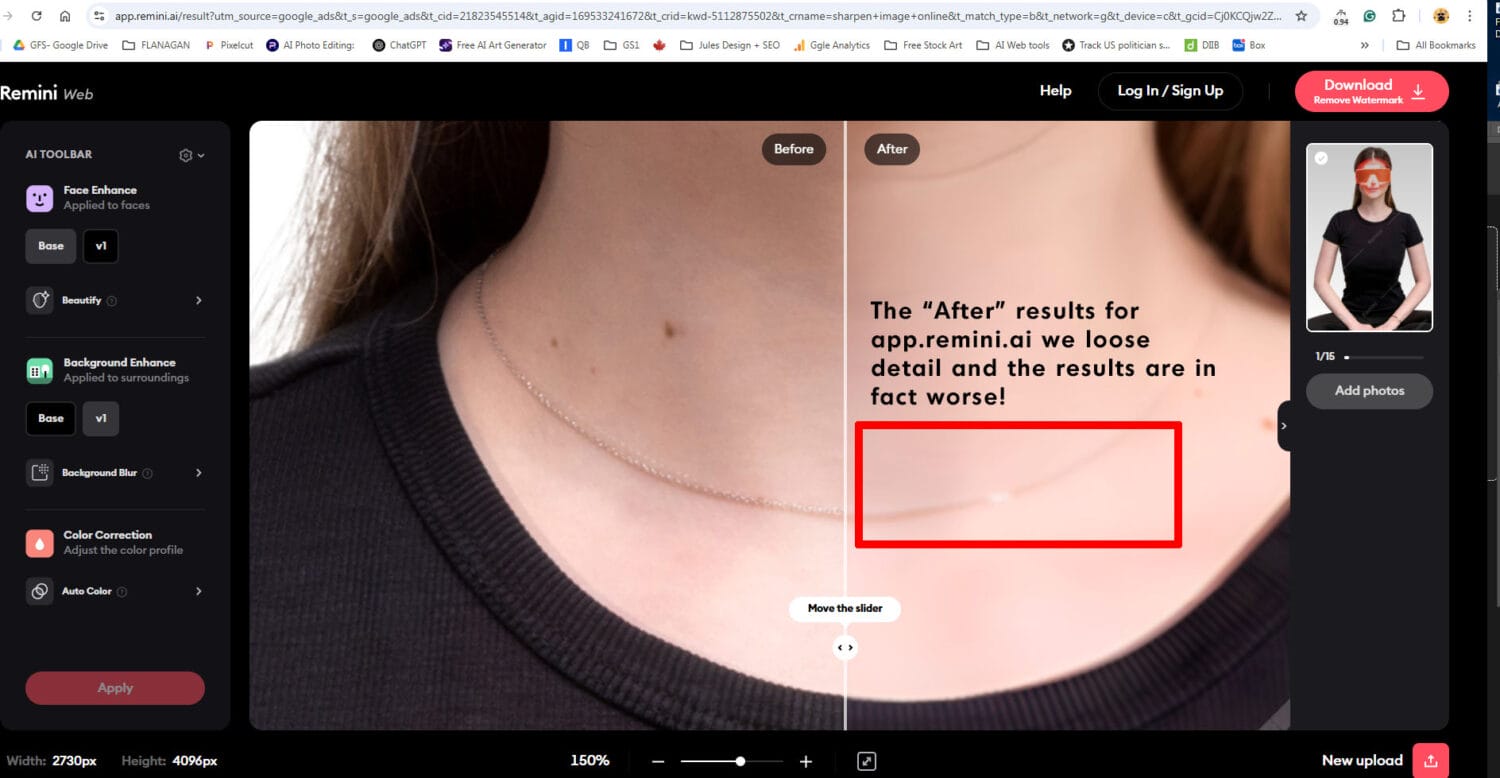 The necklace? Mushy and artificial. The green strap? Smoothed over like plasticine. The fabric texture? Lost entirely. In the end, the AI introduced more artifacts than it resolved.